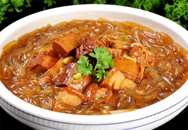 4、豬肉燉粉條,武隆苕粉是零添加健康產品,堅持只用當地核心產區的仙女紅武隆紅寶石紅薯,經過3沉3淀,16道工藝匠心制作而成。豬肉燉粉條可以說是武隆人待客必選菜,臘肉的香糯加上粉條的韌勁,相信武隆的這道特色菜絕對可以征服你的味蕾。
