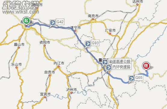 6、沿包茂高速/渝湘高速/G65行駛138.4公里(經巴南收費站),從武隆仙女山/武隆服務區出口離開,朝武隆/仙女山方向(經武隆收費站),從環島的第1個出口離開,進入S203;(此路段收費收費70元)