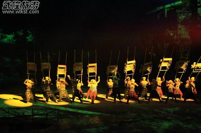 《印象·武隆》 以群眾生產生活、民風民俗、歷史人文和美麗傳說為藝術素材,尤其是以川江號子的消失為主線喚起人們對文化的傳承。 這是“抬滑竿號子”。另外還有“打夯號子”,“抬石號子”等。