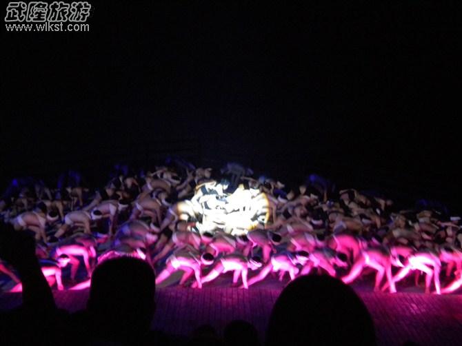 走過隧洞,來到一片開闊地,這便是專門為《印象·武隆》設計的露天劇場,據說燒了2個億。此地名為“桃園大峽谷”,三面環山,一面臨谷。座位依山而設,全部通電,不能挪移,椅背后面那亮著的部分顯示著座位號,椅子下面備有雨衣。中間一個小小的平臺作為演出場地,而這個平臺的下面就是深谷。于我來說,不要說在上面跳舞,如臨深淵的感覺,想想都十分可怕。