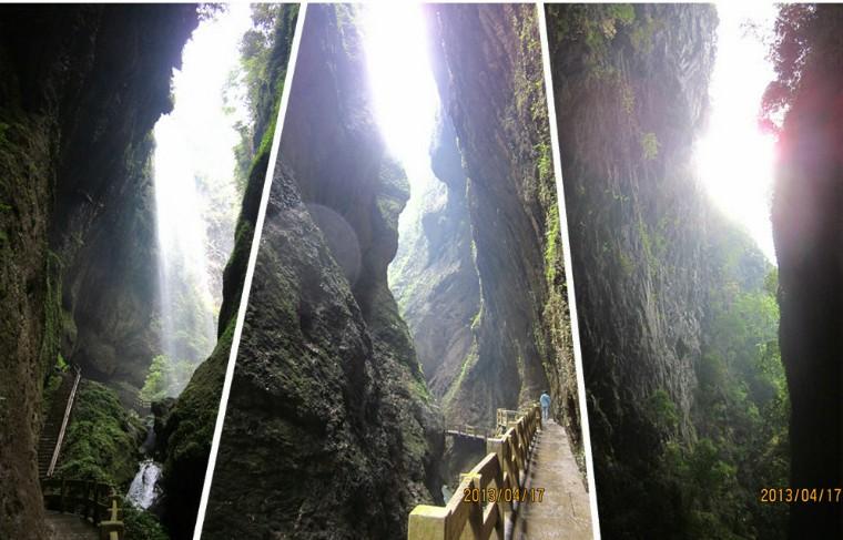 說是地縫,果然足夠狹窄,由棧道一直蜿蜒向下來回曲折幾層。來時聽說這邊也很久沒有下雨了, 可是山體仍然極其濕潤,巖間滴水無數,讓我們一直籠罩在朦朦的水霧中,而這喀斯特地貌形成的巨大巖窟,進深幾十米,陽光終年不進,更是讓人頓起寒意,不敢久留。