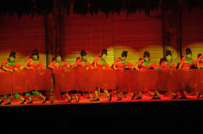 尤為讓我震驚的是:演出之前我在想,現場旁邊怎么還有個農民的草棚?是還沒來得及拆遷?演出了才知道那是個釋放色彩斑斕的燈光背景。好大一座山擋住了視線,沒有一絲改變的痕跡。結果是川江號子絕好的字幕 背景,不需要作任何修飾。 現場是那么安靜和簡潔,沒有一絲華麗的色彩,也看不見一個演職人員,包括我的朋友。可演出中卻爆發出一幕幕的精彩!。。。。。