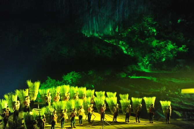曾經置身于“印象武隆”第一次試演的現場,那是2011年國慶前的夜晚,在現場作執行編導的朋友給了我2張位置正中的票,讓我有機會看清每一個角落的表演。雨淅淅瀝瀝,沒有風,可有絲絲寒意。淡淡憂傷的背景 音樂,伴隨著飄飄灑灑的燈光把我帶入了一個夢幻的世界。