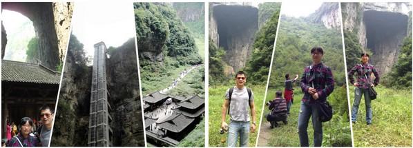 如果說我們第一天沒有體會到中國人國慶節的熱情,那么第二天我們便被這種熱情團團包圍。 早上8點驅車來到游客中心,昨晚空曠的廣場全部停滿了小轎車,我們被迫將車停在了路邊便沖進游客中心買票。先把景點的票價向各位報告一下:天生三橋135,地縫115,仙女山60,芙蓉洞120,印象武隆238。這里非常感謝羅老師的兩本重慶游年票, 持年票本人免費,所帶的人可打9折。 本隊成員6人有老年證購半票,4人因年票也相當于享受了4.5折票。(這小便宜占得)排隊1小時后購到票,坐景區觀光車5分鐘不到(該觀光車費40元 ) 送我們到天生三橋的入口,景區為了疏散游客,分別把游客送到天坑的兩個入口,一邊入口是電梯,而另一邊是石梯。我們沒的選直接送到了石梯邊,一路向下走了半小時才下到坑底。