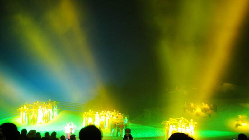 晚上,在距仙女山鎮約9公里的桃園“U”形大峽谷欣賞由張藝謀任藝術顧問,100多位特色演員現場真人真情獻唱的“印象·武隆”實景歌會。說真的,莊主被深深地震撼了。高低落差180米的實景劇場,遠山神秘,近山雄奇,溝壑清幽。劇場保護了生態,舞臺延伸至看臺,看臺又融入舞臺。70分鐘的演出讓莊主親身體驗了自然的壯美和巴蜀獨特的風土人情。特別是,那高亢嘹亮的川江號子粗獷豪邁中不失幽默,兼有幾分悲涼,不由令我想到酈道元《水經注》“巴中三峽巫峽長,猿鳴三聲淚沾裳”的文字。并不得不佩服鄉黨張藝謀的藝術才華。張藝謀玩藝術正如秦人玩政治,其特點還是兩個字——厚重。晚上,看完“印象·武隆”實景歌會,莊主心情久久不能平靜,忍不住用手機記下當時的感受:看了武隆天坑,不知人生何坑之有;聽了落寞千年的川江號子,不知人生何為遺憾……