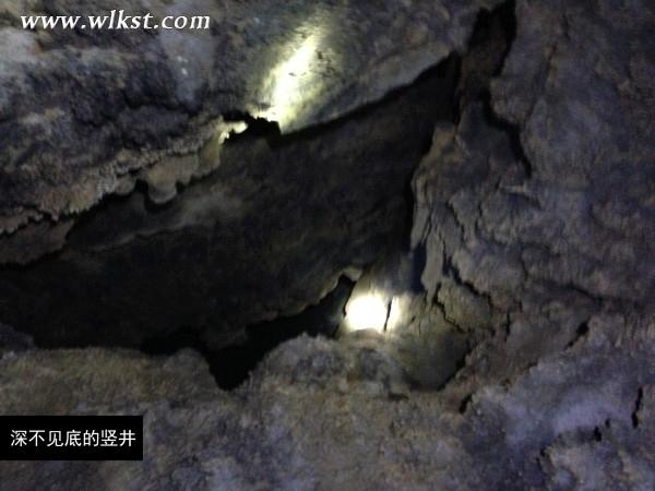 ”這邊就有個哈,大家注意哦!“在我們剛爬上的洞口旁,便有一個深不見底的豎井。