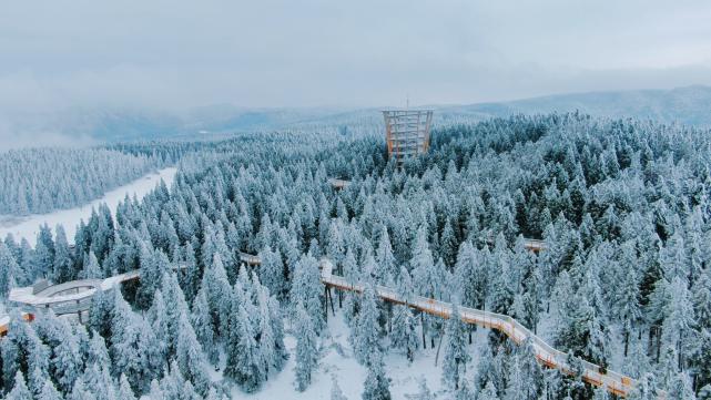 作為仙女山美景的極品景觀,其壯觀的雪景景致在西南地區(qū)乃獨(dú)樹(shù)一幟。這個(gè)冬天一定要到仙女山看雪,看看南方的大雪紛飛、林海雪原。仙女山的雪溫柔又細(xì)膩,雪染枝頭宛若正演繹一首冬日浪漫戀歌,棧道兩旁的大樹(shù)化身雪樹(shù),一座一座的三角形房子像極了城堡,一幀一畫美到令人窒息。