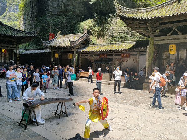 五一期間,武隆各大景區精彩活動不間斷,其中,天生三橋景區準備了武俠風黑衣人打卡、古箏彈奏、現場舞劍等表演;仙女山景區準備了《印象武隆》、背篼舞等快閃演出節目,每天3至5場;萬峰吶溪原鄉準備了盲人敲鑼、丟沙包、轉陀螺、踢毽子等童年趣味游戲,參與者通過大轉盤均有機會贏取景區門票、紅包等獎品。