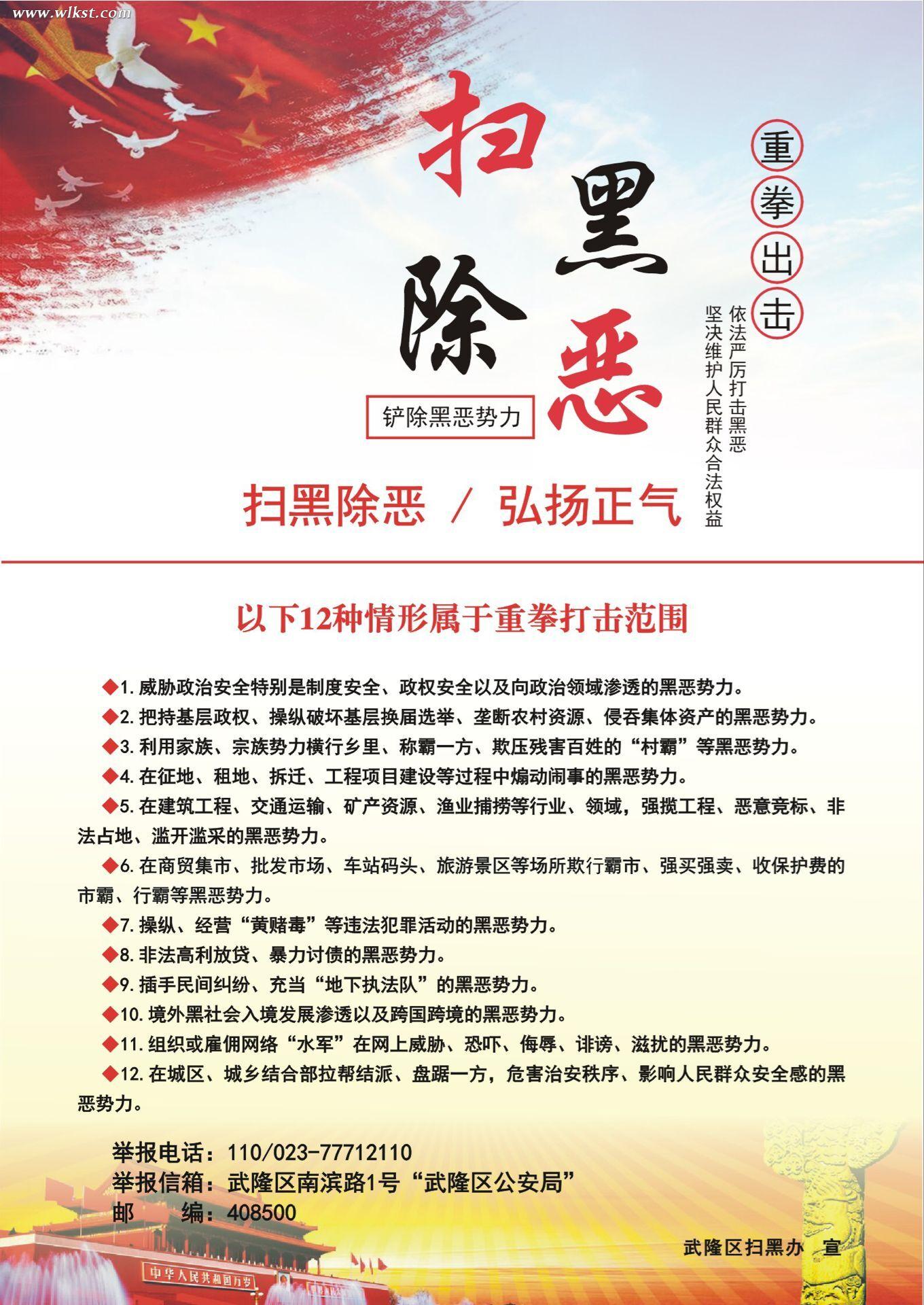 武隆區(qū)掃黑除惡舉報方式:舉報信箱:重慶市武隆區(qū)巷口鎮(zhèn)南濱路1號“武隆區(qū)公安局”(郵編408800);舉報電話:023-110;023-77712110;023-77824586;