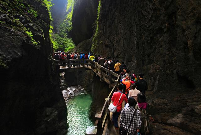 在景區(qū)中轉(zhuǎn)車(chē)的運(yùn)輸下,接連不斷的游客從仙女鎮(zhèn)游客接待中心抵達(dá)龍水峽地縫景區(qū),由于客流量十分巨大,景區(qū)開(kāi)通了第二進(jìn)口通道,以分散客流,緩解接待壓力。受昨日下雨的影響,景區(qū)內(nèi)部地面濕潤(rùn),數(shù)十位導(dǎo)游、解說(shuō)員在入口處不厭其煩地提醒游客不要擁擠,注意腳下的地面,以免發(fā)生安全事故。