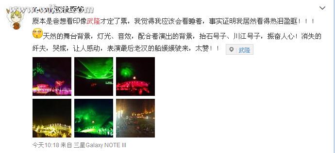 網友T-enny還沒耍夠:“原本是爸想看印像武隆才定了票,我覺得我應該會看睡著,事實證明我居然看得熱淚盈眶!!!天然的舞臺背景,燈光、音效,配合著演出的背景,抬石號子、川江號子,振奮人心!消失的纖夫,哭嫁,讓人感動,表演最后老漢的船緩緩駛來,太贊!!”