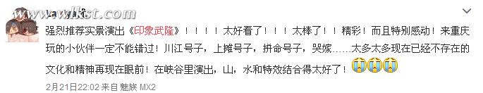 網友Laviya優:“強烈推薦實景演出《印象武隆》!!!!太好看了!!!太棒了!!精彩!而且特別感動!來重慶玩的小伙伴一定不能錯過!川江號子,上攤號子,拼命號子,哭嫁……太多太多現在已經不存在的文化和精神再現在眼前!在峽谷里演出,山,水和特效結合得太好了!”