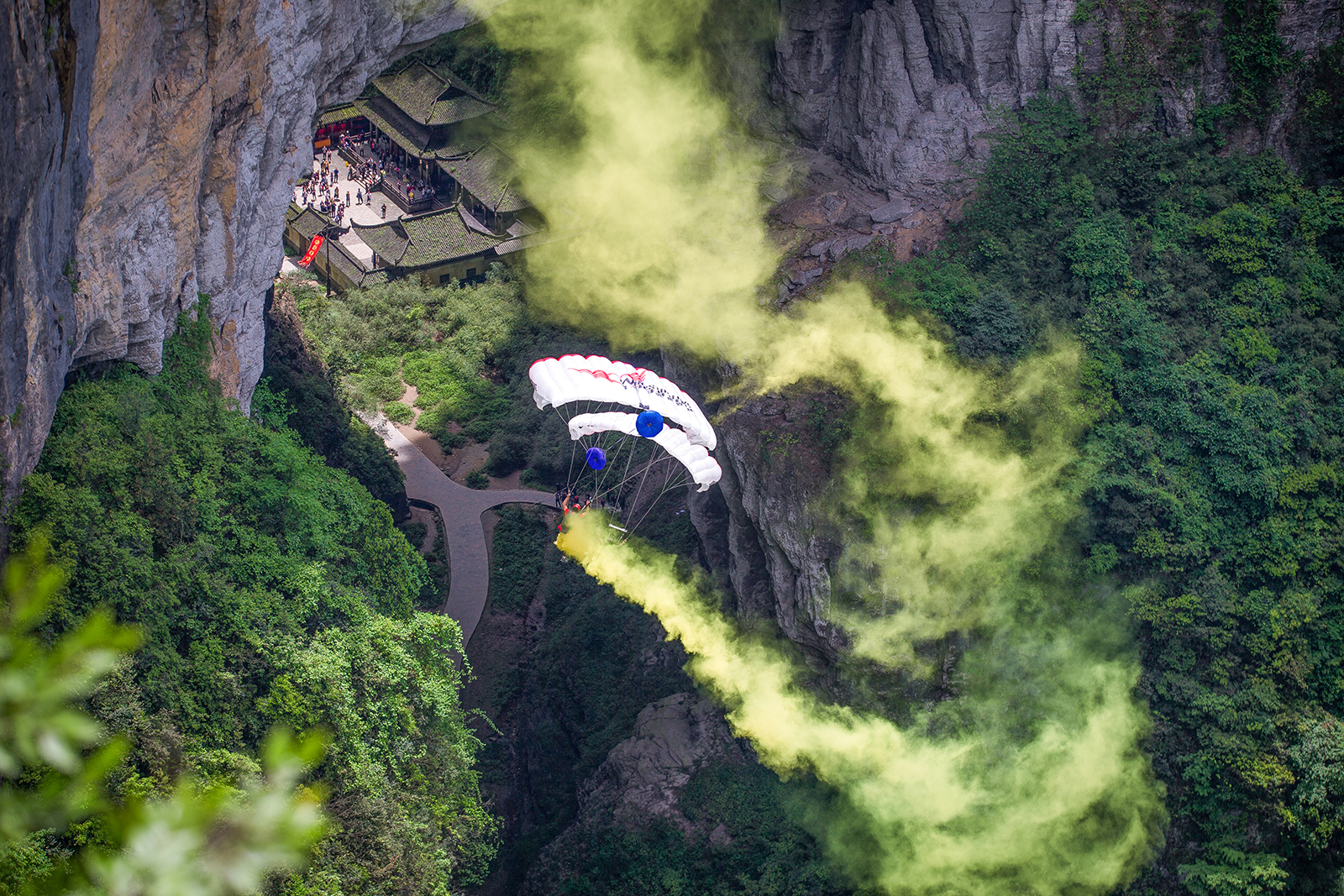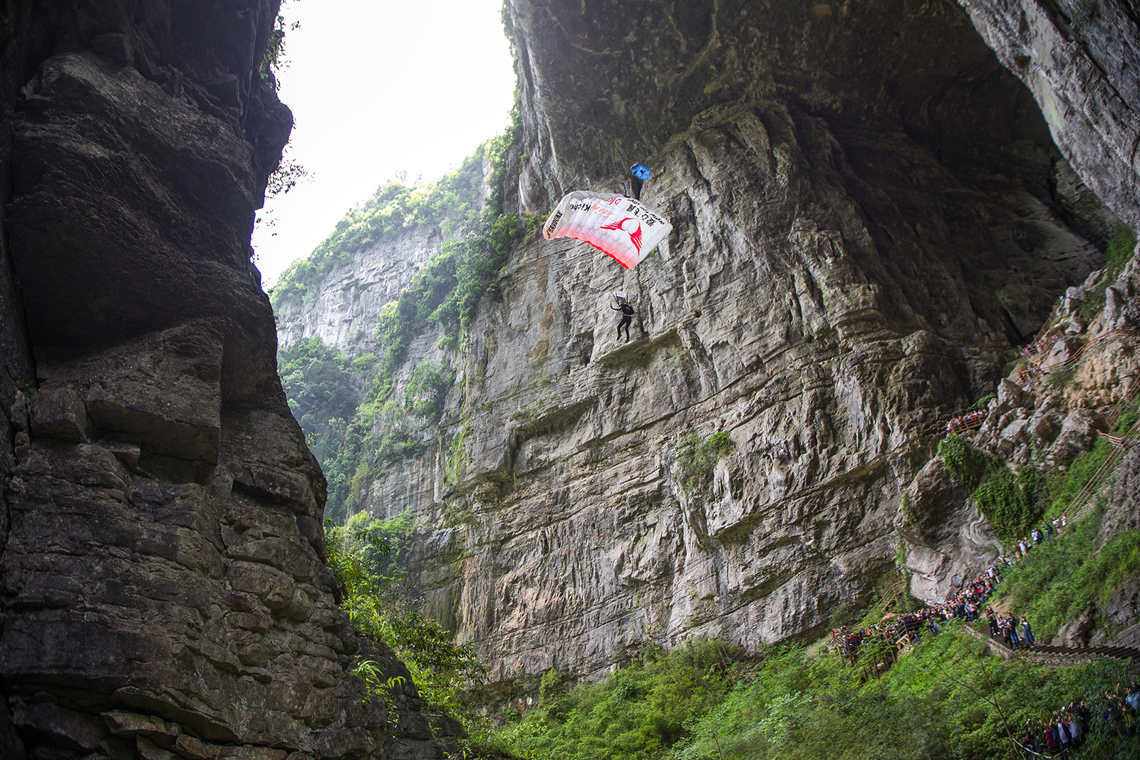 (圖/王俊杰,文/姚會)5月1日,6名世界頂級低空跳傘高手齊聚世界規(guī)模最大天生橋群——重慶武隆天生三橋,在200余米垂直懸崖絕壁挑戰(zhàn)低空跳傘,為全國觀眾帶來了一場驚心動魄的極限運動秀。