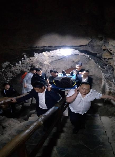 地縫景區在接到游客求助信息后,景區立即啟動應急救援預案,組織應急救援小隊對游客展開救助。5分鐘后景區救援人員趕到現場,查看游客病情后,迅速決定用擔架的方式將游客抬出景區。在長達800米爬坡上坎的景區游道路途中,救援人員輪換著用肩扛、手抬等方式用時10分鐘時間,迅速將游客抬到景區進口。大約休息10分鐘左右,游客感覺病情有所好轉。并在上車前,譚平的妹妹從包里拿出一疊鈔票飽含著淚水說道:“給大家買點水喝,辛苦大家了”,救援人員再三推辭,堅決不收。