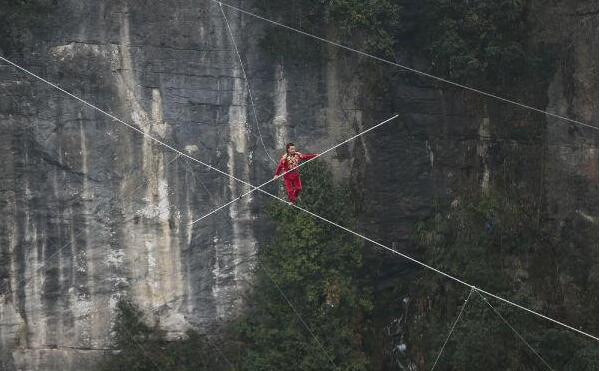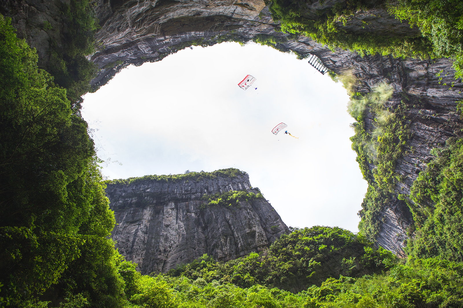 其實,許多觀眾不知道的是,天生三橋是非常聞名的以奇、險著稱的景區,已成為各類極限活動的熱門地,在此之前不久的五一節,6名世界頂級低空跳傘高手就聚集在天生三橋懸崖玻璃眺臺,在280米垂直懸崖絕壁挑戰低空跳傘,并且成功穿越了跨度不足30米的石拱橋,為全國觀眾帶來了一場驚心動魄的極限運動秀。