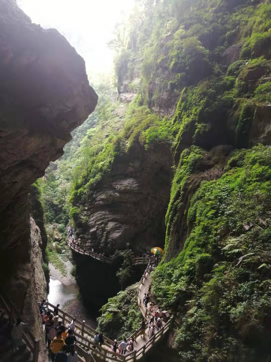 到達(dá)步行棧道后,小編看到,游客們絡(luò)繹不絕的隨著游覽線路向前行走,試圖探索大自然千年奧秘。走在那條懸在崖壁的棧道上,小編心臟跳動(dòng)的頻率越來越快,總是有一種“山窮水盡疑無路,柳暗花明又一村”的感覺。當(dāng)小編挽著褲管靠邊挪動(dòng)時(shí),其他游客要么大步前行,要么拍照留影,小編不得不豎起大拇指為他們點(diǎn)一個(gè)大大的贊。