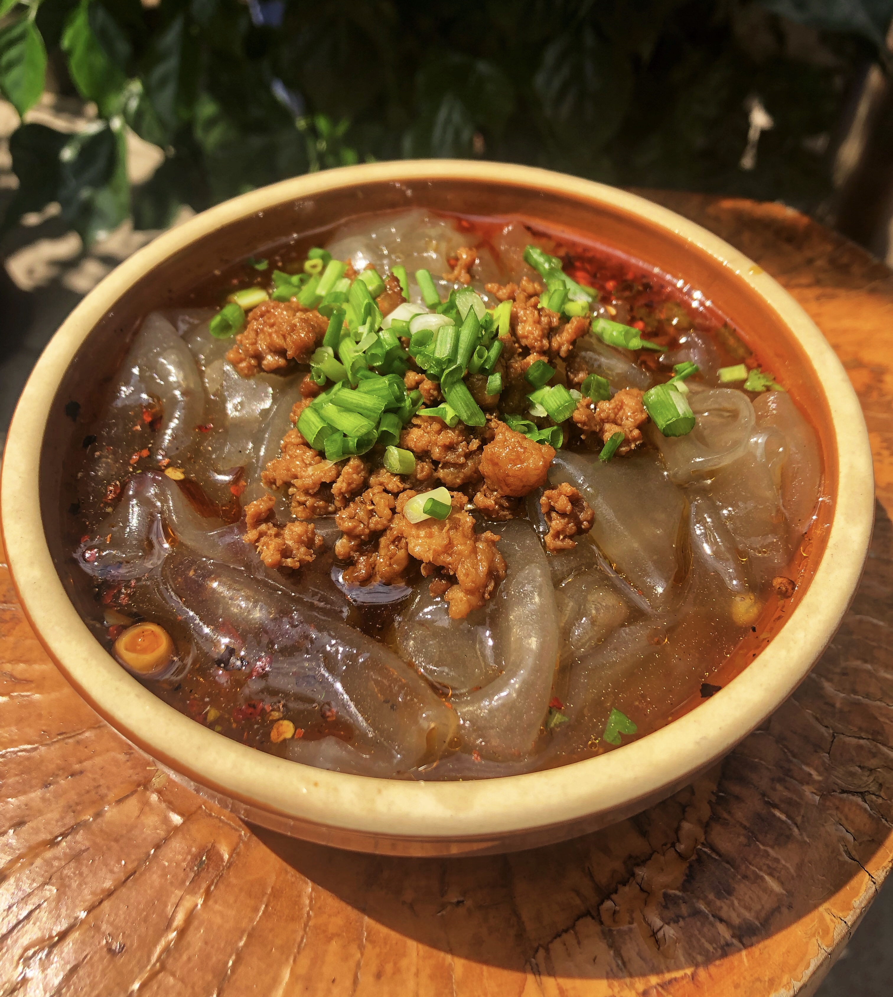 中國苕粉源出武隆。1563年,紅薯(又名紅苕)傳入中國,因武隆特有氣候、巖土、夕曬、江風(fēng)、泉水,使紅薯自然演變成紅皮、脆甜、清香的武隆紅寶石紅薯。康熙年間,武隆烏江邊一纖夫以此原料研制而成苕粉,以其“鮮糯筋道”聞名遐邇。在重慶,紅薯也叫紅苕,“苕粉” 也就是我們?nèi)粘Uf的紅薯粉。相比較尋常小吃,“苕粉” 是粗糧制品,含有大量的蛋白質(zhì)、維生素與礦物質(zhì),經(jīng)常食用苕粉能減少熱量攝取,是減肥的最佳食品之一。