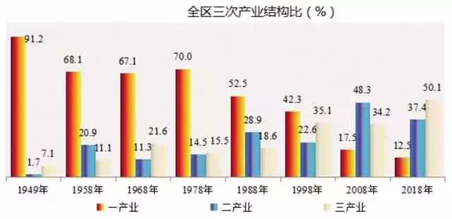 以旅游業(yè)為代表的第三產(chǎn)業(yè)發(fā)展壯大,使武隆區(qū)的三次產(chǎn)業(yè)結(jié)構(gòu)分布更加合理。2018年,武隆區(qū)第一、二、三產(chǎn)業(yè)占比分別為12.5%、37.4%,50.1%,而這一數(shù)據(jù)在改革開放初期的1978年分別為70%、14.5%、15.5%。