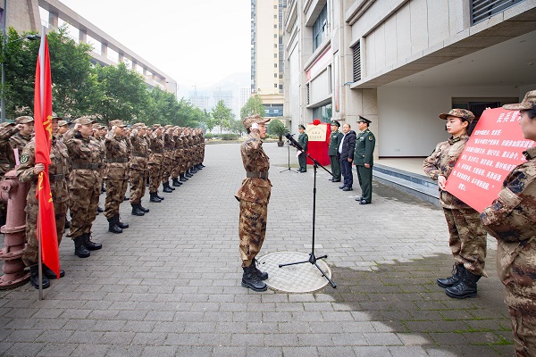 “我們的隊(duì)伍向太陽,腳踏著祖國的大地,背負(fù)著民族的希望,我們是一支不可戰(zhàn)勝的力量……”上午10點(diǎn)30分,在武隆喀斯特公司一樓廣場(chǎng),“仙女山女子民兵連”全體成員高唱《中國人民解放軍軍歌》,澎湃激昂、鏗鏘有力。隨后,區(qū)人武部政委馬宏偉宣布“仙女山女子民兵連”成立,并宣讀連排職干部任職命令。