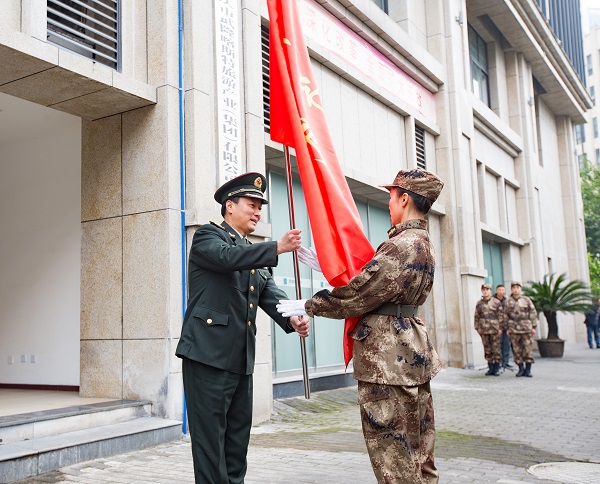 區(qū)委常委、區(qū)人武部部長涂小奎為“仙女山女子民兵連”授旗。