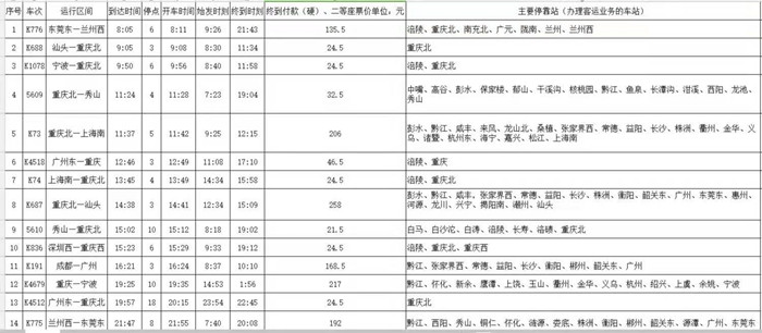 武隆站旅客列車綜合時刻表