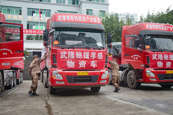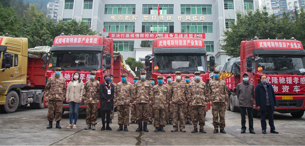 踐行社會(huì)責(zé)任,全力以赴投入到抗擊疫情的戰(zhàn)役中。武隆喀斯特旅游產(chǎn)業(yè)(集團(tuán))有限公司黨委高度重視,為確保生活物資快速、順利抵達(dá),特委派蔣德明、李興明、王震、汪仁芳、張德輝等10名優(yōu)秀員工負(fù)責(zé)此次運(yùn)輸,車(chē)隊(duì)于2月25日10點(diǎn)35分從武隆高速路口出發(fā),(集團(tuán))公司副總經(jīng)理黃小林受公司黨委書(shū)記、董事長(zhǎng)呂勁松委托,現(xiàn)場(chǎng)為負(fù)責(zé)此次物資運(yùn)送的優(yōu)秀駕駛員送行。