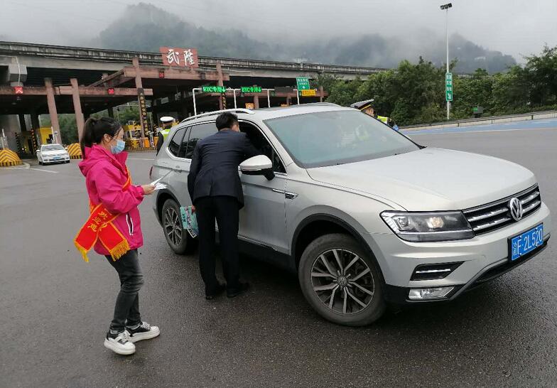 高速下道口,工作人員向自駕游客發放宣傳單。