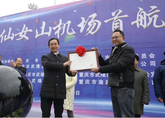 飛機降落后,在白雪皚皚的仙女山舉行了首航儀式,民航西南地區管理局為仙女山機場頒發機場許可證。