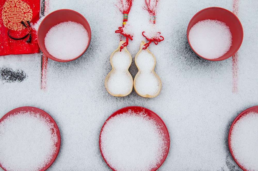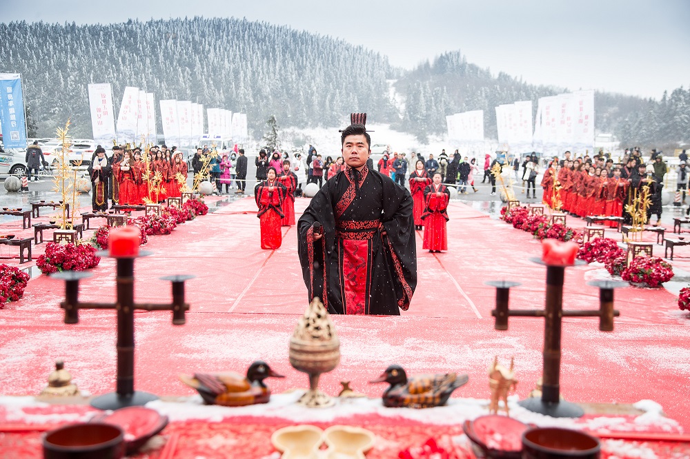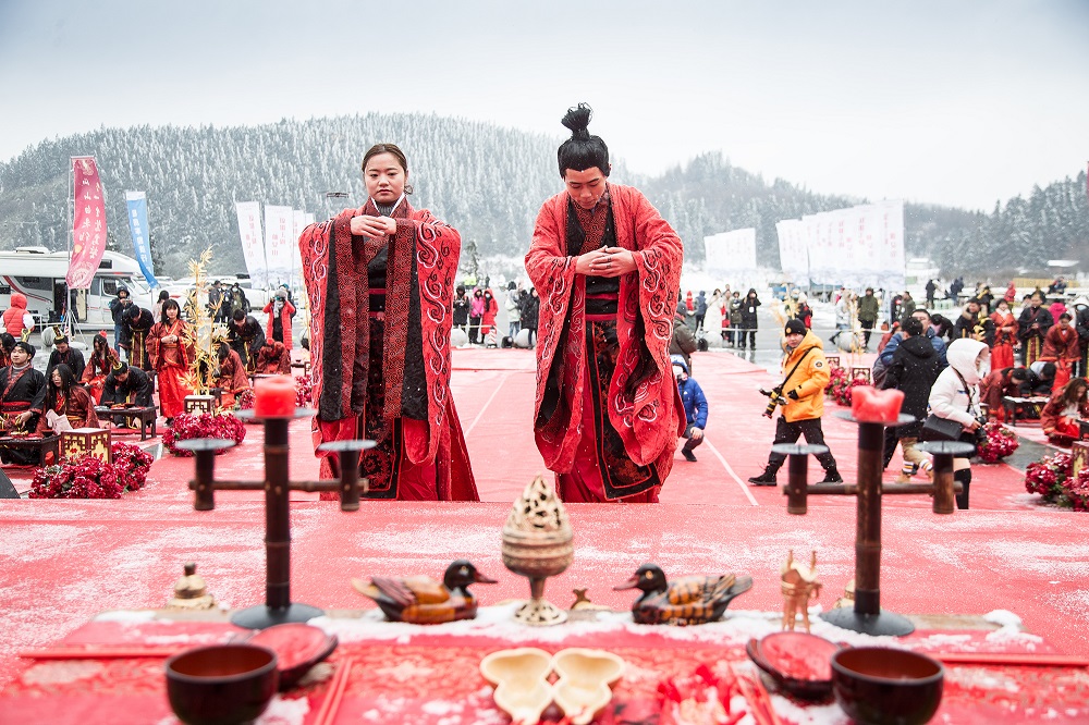 沃盥、同牢、合巹、解纓結(jié)發(fā)、執(zhí)手禮……儀式嚴格按照漢式婚禮的古老環(huán)節(jié)進行,現(xiàn)場運用經(jīng)典的紅黑色,將典雅、尊貴、莊敬的氣韻展現(xiàn)得淋漓盡致,圍觀的游客一同見證了這一浪漫時刻。而儀式舉行時,仙女山更是應(yīng)景地下著鵝毛大雪,似乎在向新人們送上“白頭偕老”的祝福。