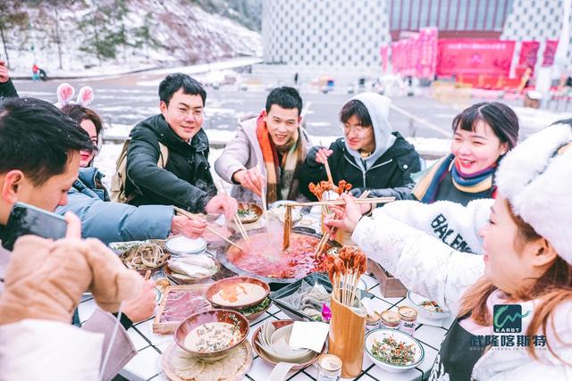 冰雪為景,牛油鋪面,鍋里翻滾的不僅有毛肚、鴨腸,還有重慶人對(duì)火鍋的赤誠(chéng)熱情,醇厚的味道在舌尖上熱烈的碰撞,一場(chǎng)酣暢淋漓的火鍋盛宴火熱開(kāi)啟。精心熬制的高湯,新鮮的食材……零下6°C,也能吃得熱血噴張,如果你在屏幕前看得流口水,不妨到仙女山一試,雪地吃火鍋,真的很帶勁!