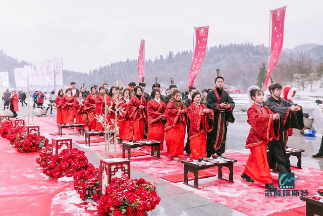 2020年,諧音“愛(ài)你愛(ài)你”,這么浪漫的年份怎么能少了雪地集體婚禮“扎場(chǎng)子”,雪地集體婚禮是每年仙女山冰雪季的重頭戲。就在武隆仙女山冰雪季開(kāi)幕式當(dāng)天,一場(chǎng)盛大的漢式雪地集體婚禮舉行。30對(duì)新人身著漢服、遵漢禮,步履優(yōu)雅、莊重地走進(jìn)雪地婚禮現(xiàn)場(chǎng)。在禮官的帶領(lǐng)下,新人們行卻扇禮、沃盥焚香、同席雅坐、同牢合巹、交換信物、執(zhí)手偕老,在古老的儀式中向彼此許下愛(ài)情承諾。