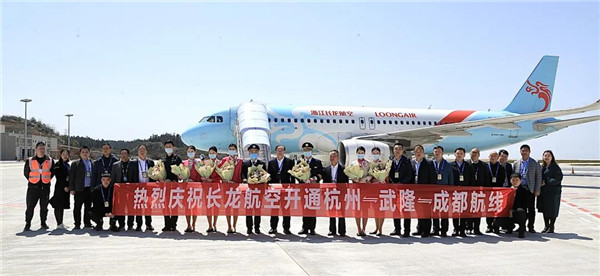 3月28日12:39,一架由長(zhǎng)龍航空?qǐng)?zhí)飛的航班號(hào)為GJ8559的空客320客機(jī)平穩(wěn)降落在重慶武隆仙女山機(jī)場(chǎng)。該客機(jī)于上10:08從杭州蕭山機(jī)場(chǎng)起飛,經(jīng)過(guò)2個(gè)多小時(shí)的飛行,順利抵達(dá)仙女山。這是航班換季后,仙女山機(jī)場(chǎng)當(dāng)天降落的第一架客機(jī)。航班降落后,舉行了過(guò)水門(mén)儀式并向機(jī)組人員獻(xiàn)花。
