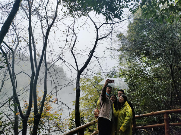 春雨中的武隆天生三橋帶給游人別樣的驚喜,自由行的小情侶們駐足拍照。