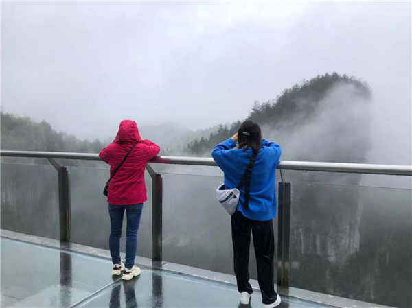 站在天生三橋上空高達280米的玻璃跳臺上,玻璃經過春雨的洗禮,腳下異常清晰。低頭腳下萬丈懸崖,抬頭眼前云霧繞山澗,仰望天空,微涼的春風迎面撲來,眼前的美景引來游客連連驚嘆,盡管有些害怕,還是忍不住拿出手機拍照。