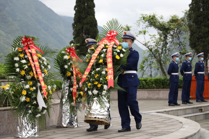 在全體人員向烈士默哀寄托哀思之情后,工作人員抬起5個花籃緩步前進,將花籃一字排列放在紀念碑基座前,黃宗華上前仔細整理花籃緞帶,緬懷先烈。