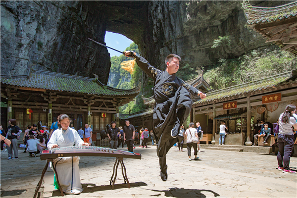 古色醇香的建筑、唯美動聽的古箏琴音、行云流水般的舞劍表演、剛?cè)岵奶珮O拳……五一期間,武隆天生三橋景區(qū)熱鬧非凡,一出出精彩的民俗文化表演圈粉吸睛,吸引眾多游客駐足圍觀。