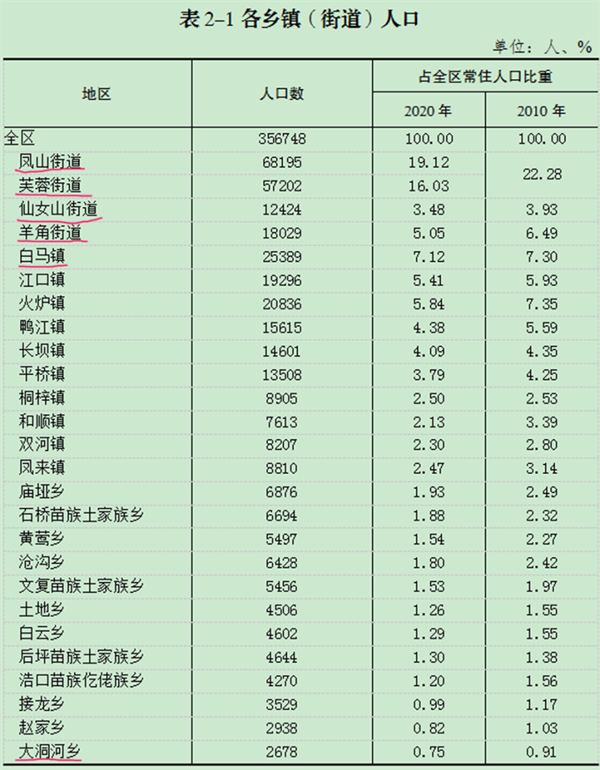 武隆四個街道,鳳山街道、芙蓉街道、仙女山街道、羊角街道。人口最多的街道是鳳山街道,有約6.8萬人,鳳山街道一直是武隆城區(qū)的核心,能有相對較多的人口,這是理所當(dāng)然的事情。