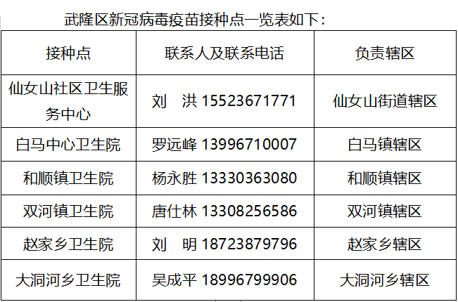 武隆區新冠病毒疫苗接種點一覽表如下: