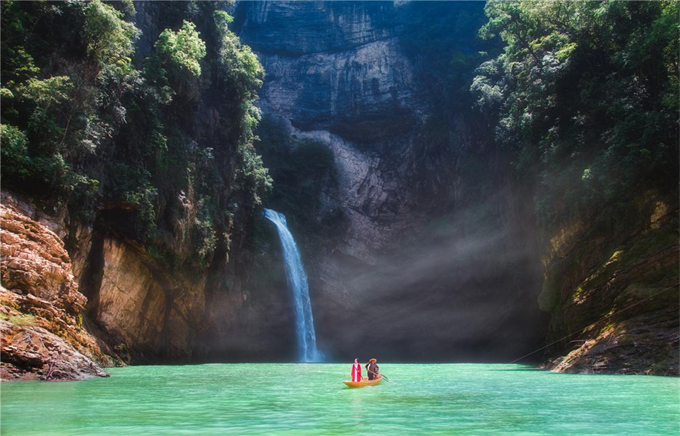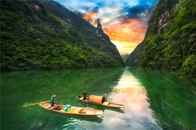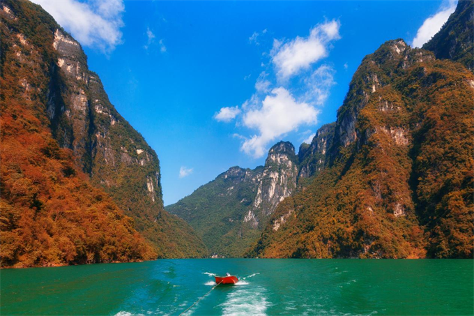 武隆美景中有海拔2000米的仙女山,也有海拔200米的芙蓉江。相比仙女山而言芙蓉江的秋色雖來得慢了些,但依舊讓人陶醉。乘坐于芙蓉江游船上,不禁想起詩(shī)人王維的“清風(fēng)拂綠柳,白水映紅桃。舟行碧波上,人在畫中游”。沿途三河口、芙蓉仙女峰、盤古苗寨、玉兔望月峰、龍孔飛瀑、黑葉猴保護(hù)區(qū)、蝴蝶谷等景點(diǎn)異常出彩。立足于船頭,融山、水、泉、洞、峽于一體的芙蓉江美景映入眼簾,兩岸青山、一江翠水、清新獨(dú)特的江風(fēng)迎面而來,給人“貌似漓江,勝似三峽”的絕美享受。