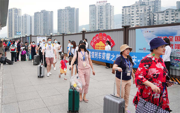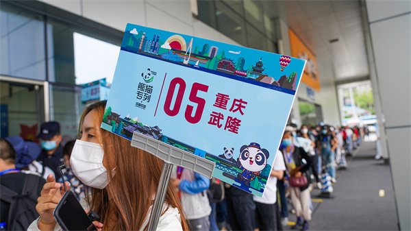(圖/王俊杰)9月14日,由成都始發的Y582次“熊貓專列”,搭載著230余名游客,順利抵達武隆火車站,開啟兩天一晚的世界自然遺產之旅。這也是新一輪疫情后,首列從四川成都發往重慶武隆的跨省游專列,標志著武隆旅游業復蘇,并由此進入“快車道”。