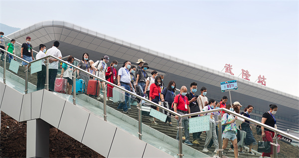 跨省旅游的恢復,并非疫情防控松懈。武隆對旅游專列的疫情防護措施,既嚴密,又讓人省心、放心、安心。記者在現場看到,從火車出站口到乘坐中轉車,從景區檢售票到觀光游覽途中,每個節點均有工作人員實行防疫監控,同時提供熱情的引導、咨詢、解答等貼心服務。