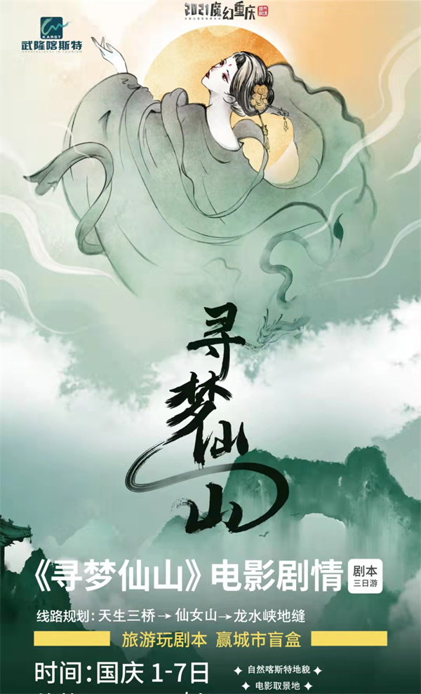 把游戲場景搬到景區,到武隆旅游又有新玩法:10月1日起,兼具電影、劇情、古風為一體的《尋夢仙山》“劇本殺”,以沉浸式旅游方式即將在武隆啟動,并連續七天為游客玩家們帶來一場前所未有的旅游體驗。此舉,是全國首創的大型城市及景區沉浸式劇本旅游項目。