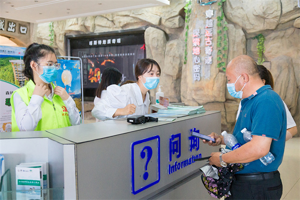 在仙女山游客接待中心、仙女山、芙蓉洞等各個景區均設置了醒目的二碼排查標識,景區工作人員對每一位游客進行健康碼查看、體溫測量等,并提醒全程佩戴好口罩,保持一米線安全距離。一系列檢查后合格的游客方可購票進入,從源頭上保障景區內每一位游客的安全。