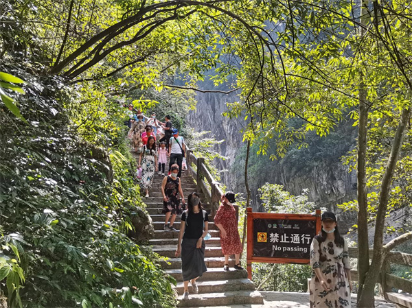 在龍水峽地縫景區,記者看到檢票窗口并未出現人山人海、排長龍現象。“今日景區人流量明顯沒有前兩日多,不管是景點游覽,還是乘坐觀光電梯都不需要排很久的隊!”據工作人員介紹。