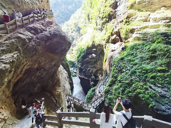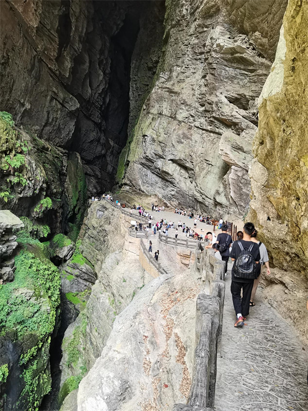 進入景區,已經有不少游客行走在一側是峽谷,一側是崖壁的狹窄棧道上。下望地心深處,當俯瞰地底下猶如萬丈深淵不見底,不少恐高游客直呼“腳桿打閃閃”。