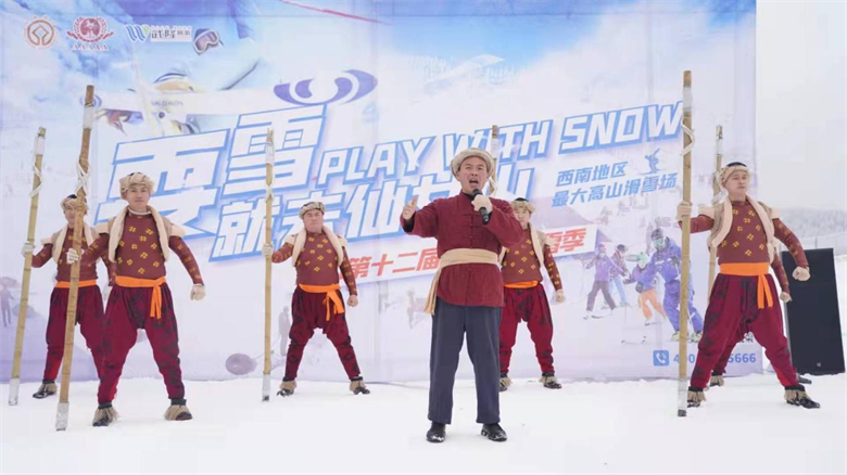 “嘿呀么佐喂,嘿呀么佐喂……”。上午10點,一聲聲整齊嘹亮的號子聲在戶外滑雪場響起。曾多次榮登《中國農民歌會》、《經典永流傳》等央視舞臺的“印象武隆”川江號子拉開了“2021第十二屆仙女山冰雪季”的帷幕。