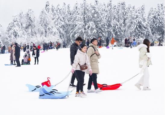 仙女山滑雪場成為孩子們的游樂天堂。只見孩子們腳踏雪橇、拄著雪杖,一路大喊著從高處滑下,感受俯沖而下的超快速度與激情;高興地在雪地里翻騰打滾;或拉著雪船盡情和爸爸媽媽嬉笑打鬧。白茫茫的雪場上到處洋溢著歡聲笑語,激情飛揚。來自重慶主城的代先生表示:春節帶著孩子來仙女山體驗滑雪,欣賞潔白無瑕的雪景,激起孩子熱愛冰雪的興趣,希望以后每年都來仙女山賞雪滑雪。