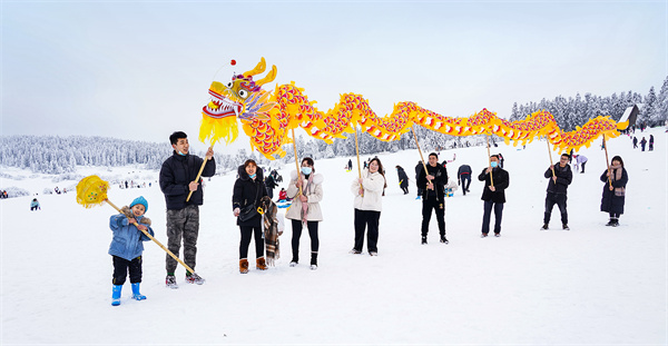 進入仙女山景區,這里張燈結彩,熱鬧非凡,處處呈現出濃厚的新春節日氛圍,游客們在如夢似幻的冰雪童話世界里,盡情地打雪仗、堆雪人、滑雪、拍照,玩得不亦樂乎,直呼過癮。同時“尋寶武隆迎新春”“舞龍表演”“冰雪世界的舞會”等系列新春活動紛呈,吸引了游客紛紛參與。