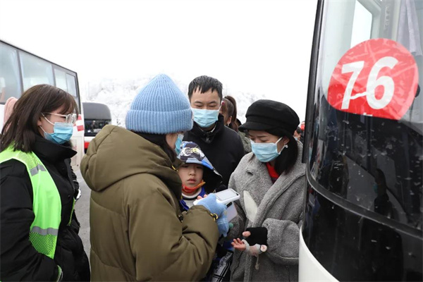 大年初一,飄飄灑灑的雪花“喚”來了游客量猛增,最初準備的旅游中轉車輛數量承載力超負荷。為使游客減少等待時間,區運管處處長謝世勇及時向上匯報,協調申請新增了25輛旅游中轉和加班車輛,縮短發車時間,提高運載能力,成功地輸送了一批又一批游客。