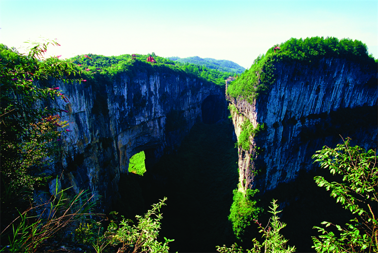 在武隆仙女山南部深藏著一處集雄、奇、秀、美于一身的天生三橋,三座橋的高度、寬度、跨度分別在150、200、300米以上,三橋呈縱向排列,平行橫跨在羊水河峽谷上,將兩岸山體連在一起,形成了"三橋夾兩坑"的宏偉奇觀。即便是從全世界范圍來看,在距離幾百米之內就有如此宏大的三座天生石拱橋和兩個巨型的由塌陷形成的天坑也是世間罕見的。而且三橋的獨步之處還在于三橋彼此之間林森木秀、懸崖萬丈,修竹搖曳、飛泉流水,一派雄奇、蒼勁、神秘、靜幽的原始自然風貌,以山、水、瀑、峽、橋共同構成了一幅完美的自然山水畫卷。